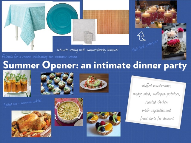 Here’s the plan for my first dinner party this summer. It’s a small intimate setting with 5 guests and since it’s my summer opener I’m thinking ocean blues, natural elements, pink floral & candle light table decor. The menu took a bit of thought cause I want items that are simple but still give a warm family/home cooked feel. The guests at this dinner are 4 of my childhood girlfriends. I’ve known these ladies since I was a freshman in high school. I definitely don’t want to spend the evening in the kitchen. I want yummy & homemade foods that aren’t too heavy after all this is a ladies dinner. I’m planning on making a oven roasted chicken with scalloped potatoes with goat cheese & roasted veggies. All fan favorites in my house. We’ll start with a rum tea welcome drink served with stuffed mushrooms and will open with a wedge salad which I think will be a good balance to the chicken and cheesy potatoes. We’ll see how it goes! Stand by for a full report with pics & recipes.